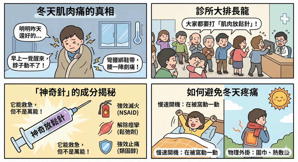 寒流來襲,診所湧入大量「閃到腰」與「落枕」的患者,大家一進門就指名要打「肌肉放鬆針」。但你知道它的成份嗎?要如何避免再發生呢?