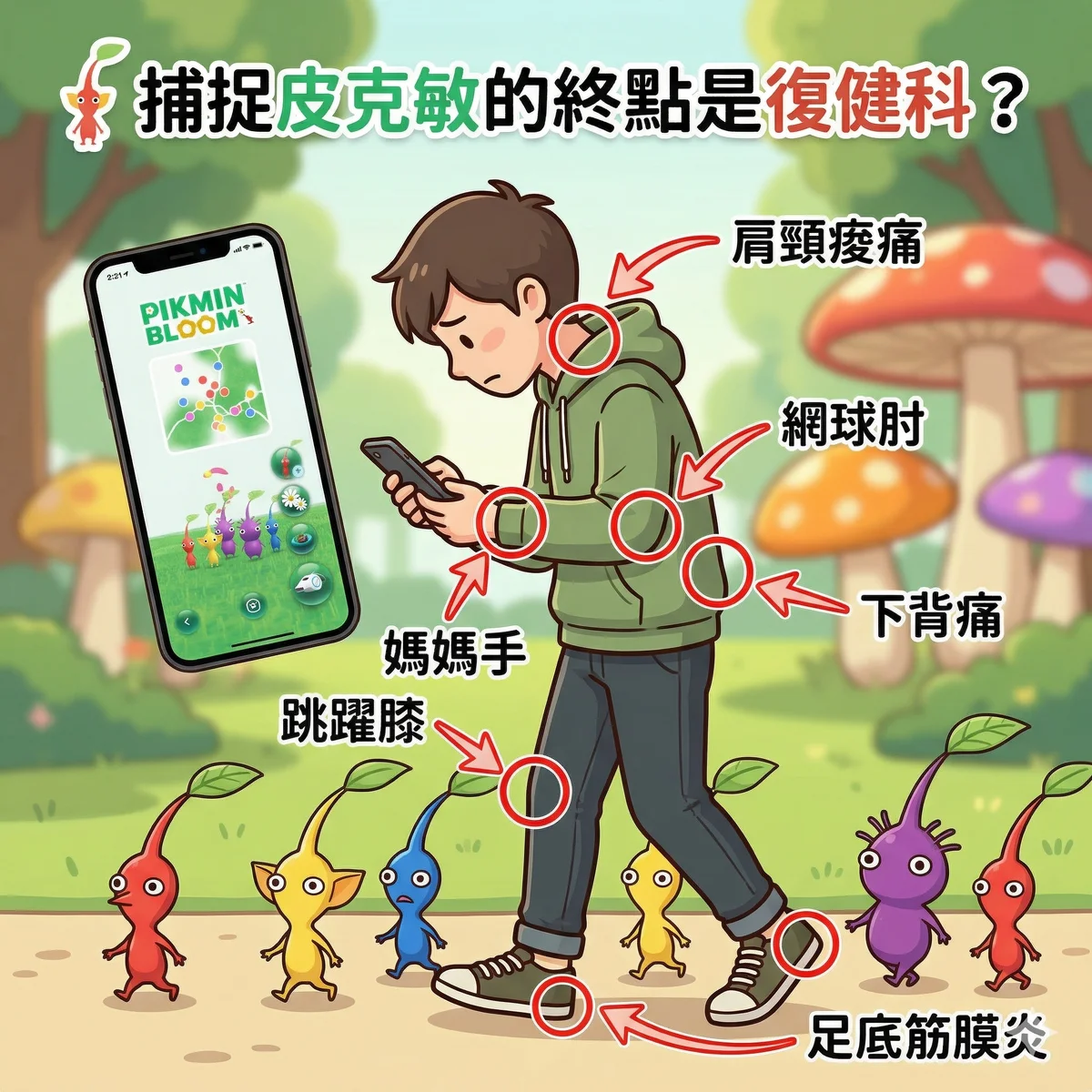 最近《皮克敏 Bloom》大爆紅,但長時間低頭滑手機加上突然暴增的步行量,容易讓身體吃不消。復健科醫師為您盤點皮友常見的手遊與走路症候群!