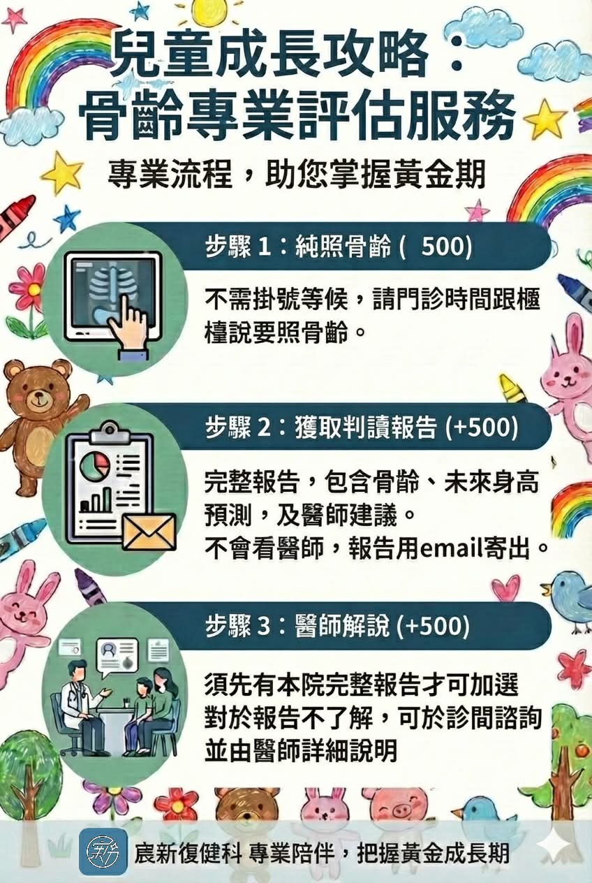 新竹宸新復健科提供專業的兒童骨齡檢查服務。我們最大的特色是:不需要預約、不需要掛號、不需要漫長等待,僅需一秒鐘拍攝左手 X 光片,且輻射劑量極低,安全無虞。