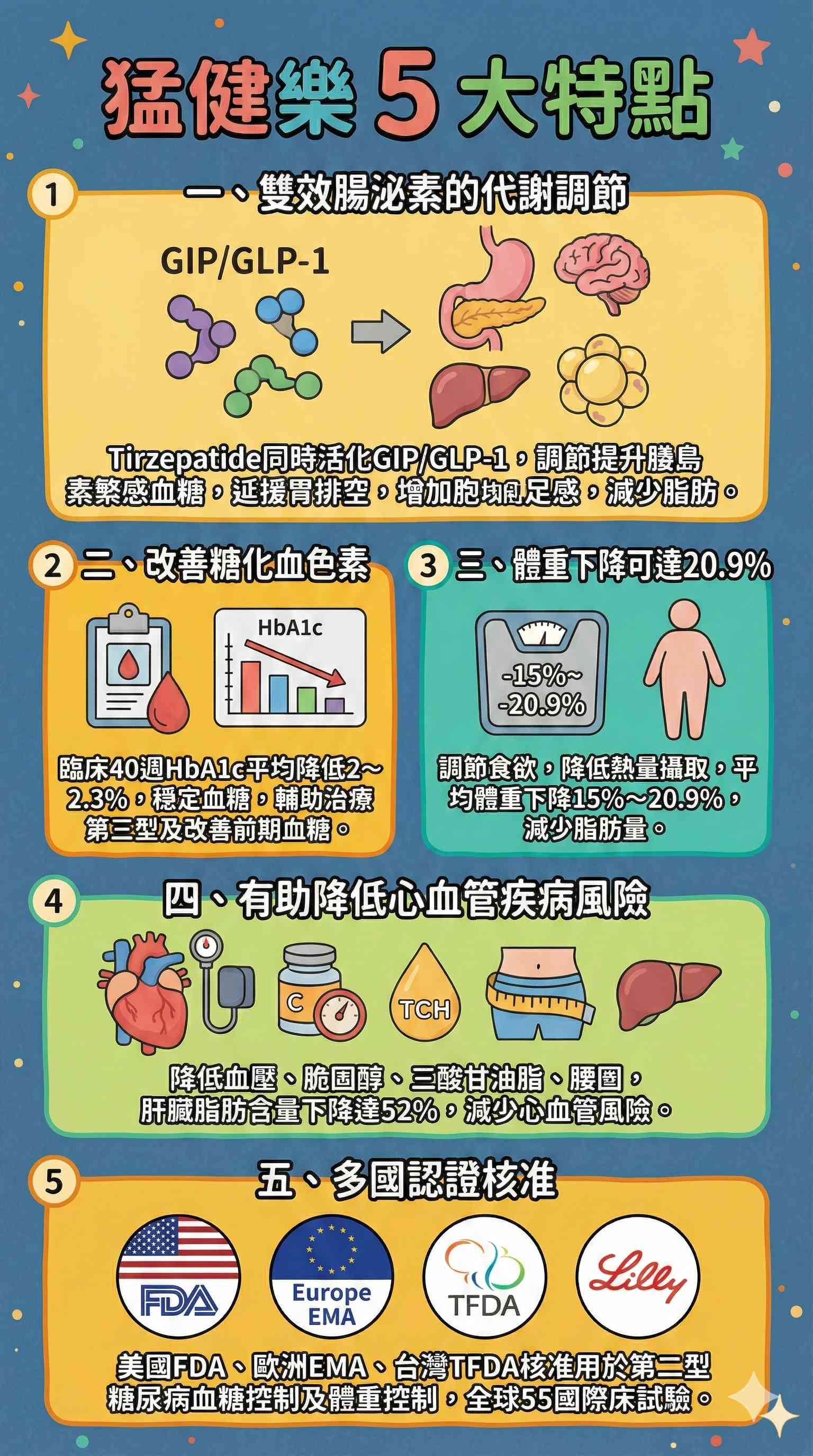 臨床研究顯示,猛健樂能提供比傳統單一機轉藥物(如善纖達、週纖達)更卓越的體重控制與血糖管理效果,是目前對抗頑固型肥胖、代謝症候群與多囊性卵巢的新利器。